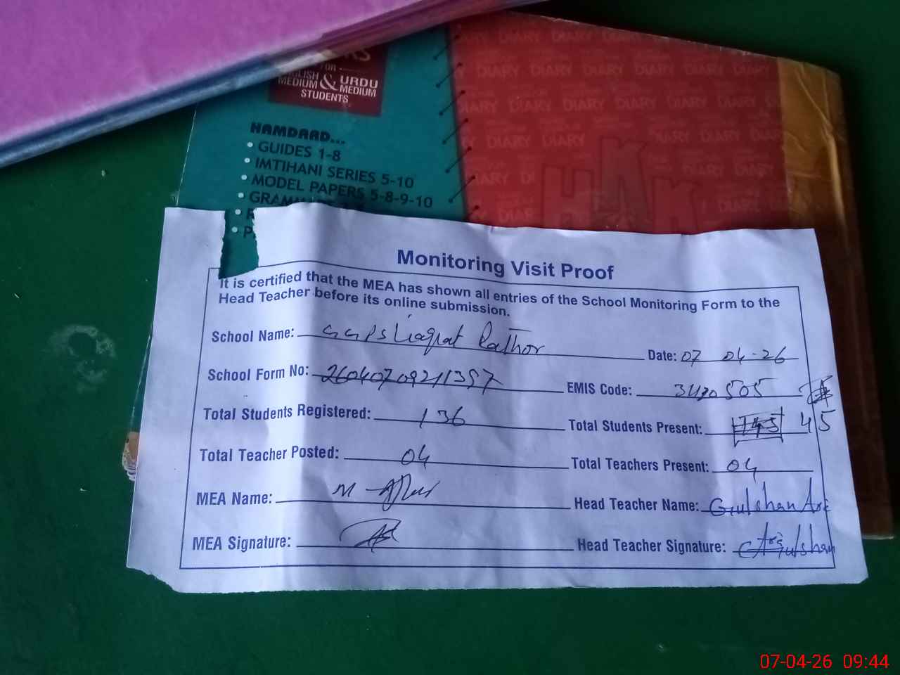 | Attendance Register | Head Teacher | MEA with School | Visit Proof |