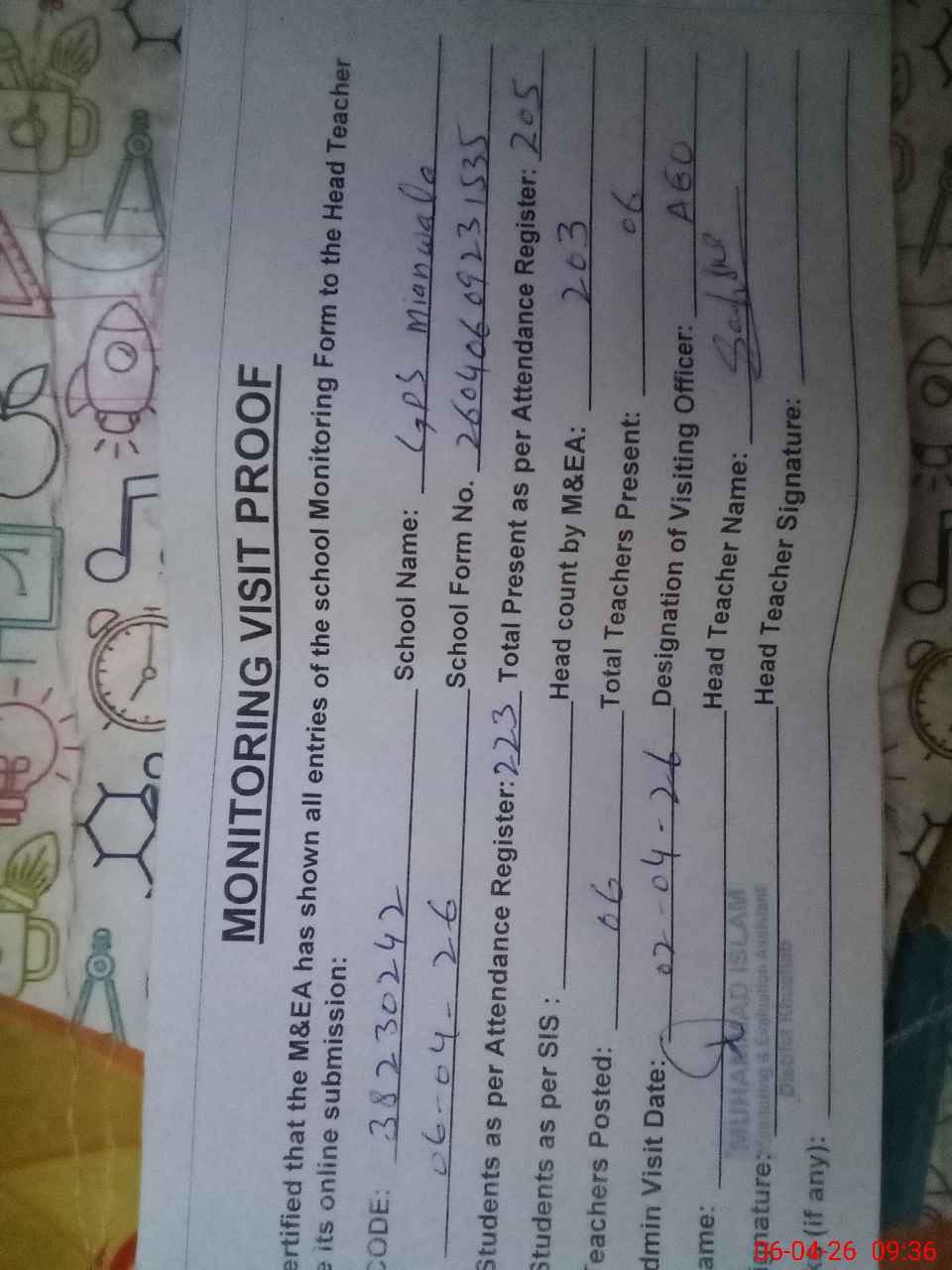 | Attendance Register | Head Teacher | MEA with School | Visit Proof |