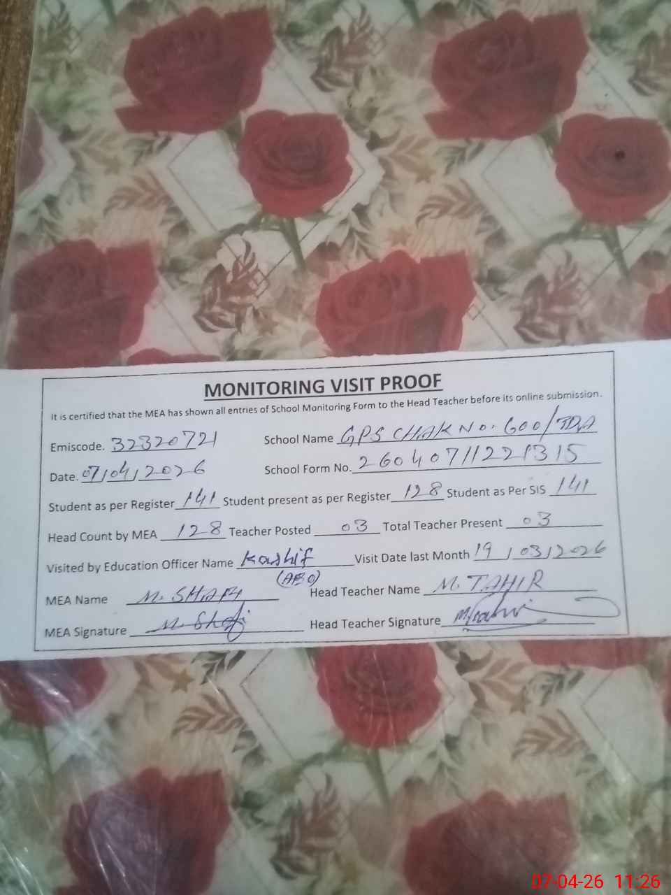 | EMIS Code: 32320721 | Name of School: GPS CHAK NO. 600/TDA | |||