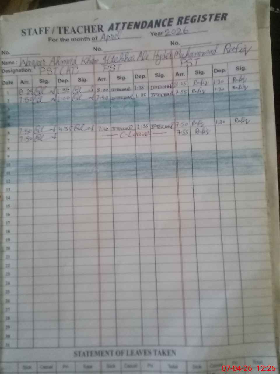 | CNIC | Full Name | Designation | R/C | Absence During Last Calender Month |