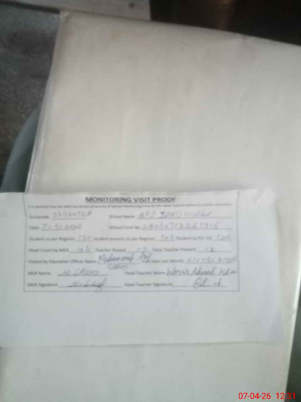 | Attendance Register | Head Teacher | MEA with School | Visit Proof |
