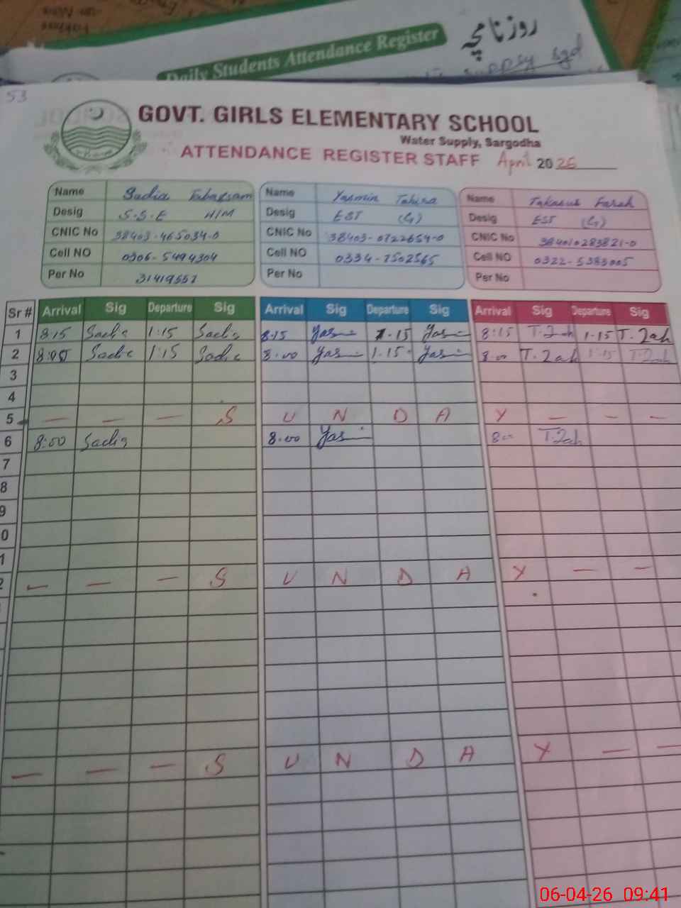 | CNIC | Full Name | Designation | R/C | Absence During Last Calender Month |
