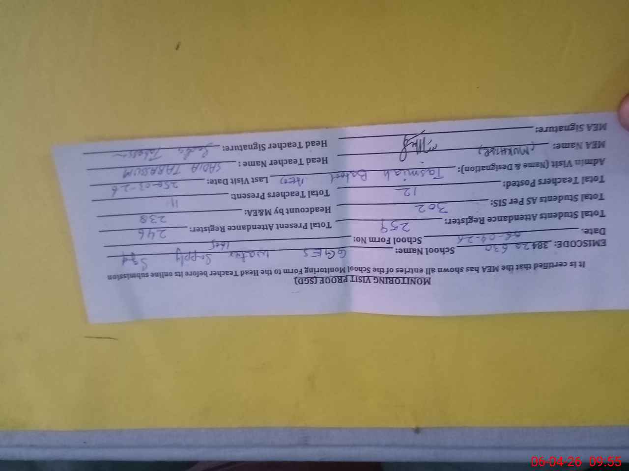 | Attendance Register | Head Teacher | MEA with School | Visit Proof |