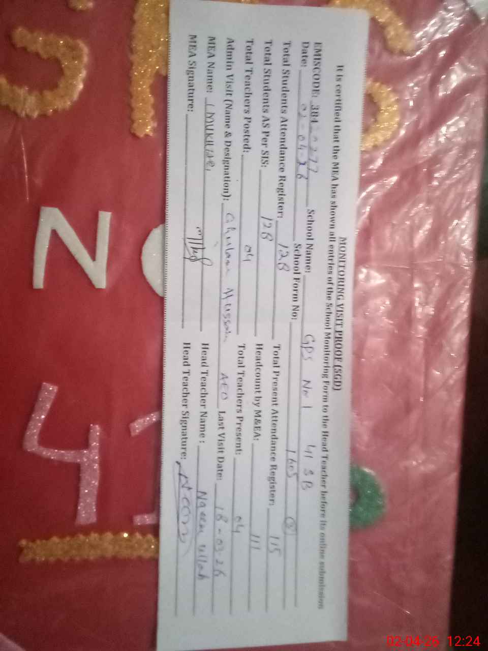| Attendance Register | Head Teacher | MEA with School | Visit Proof |