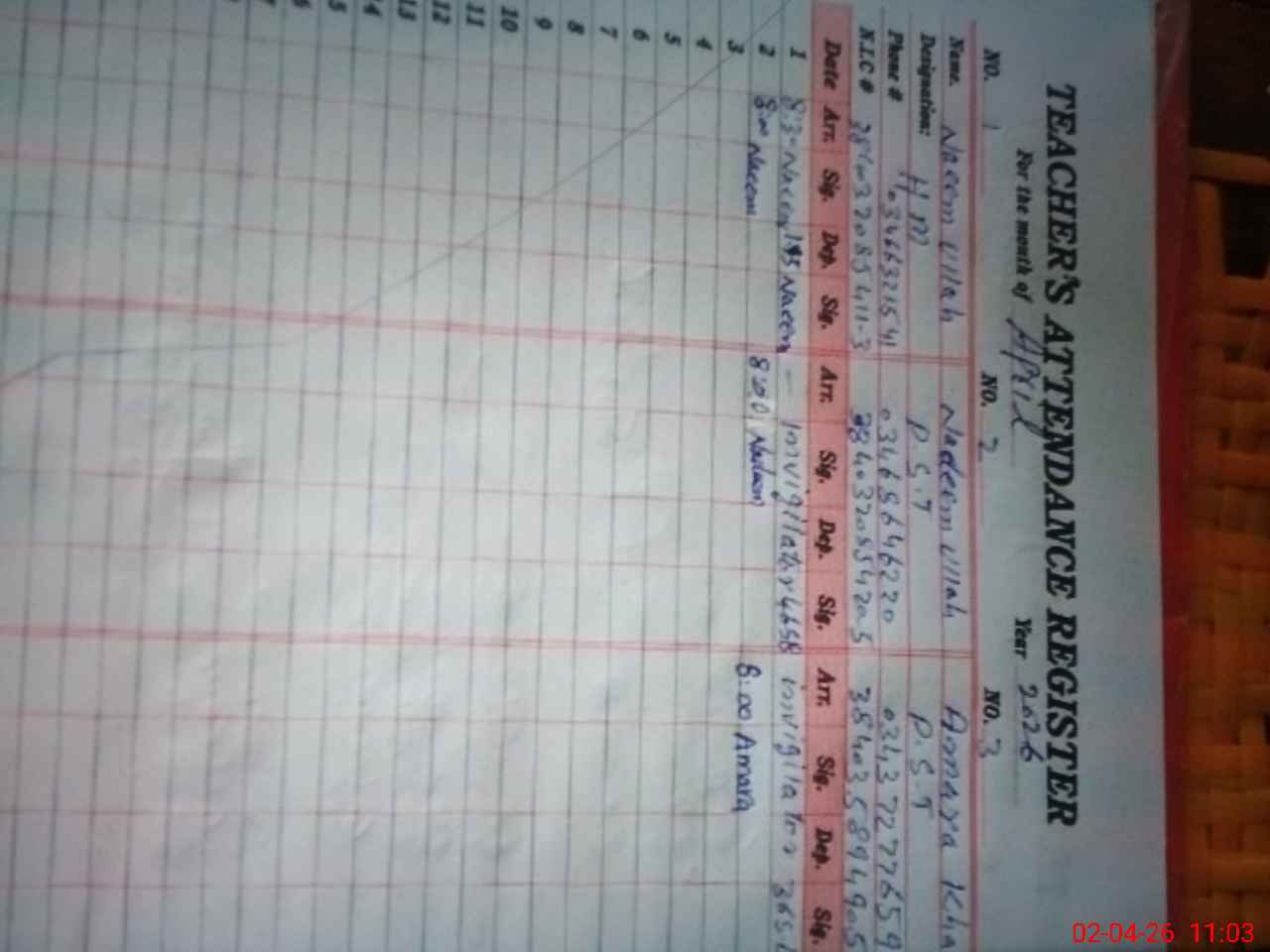 | Name: NA**** UL**** Designation: (School Headmaster's/Headmistress's) PTC/JV Phone/Cell Number: 03**** |