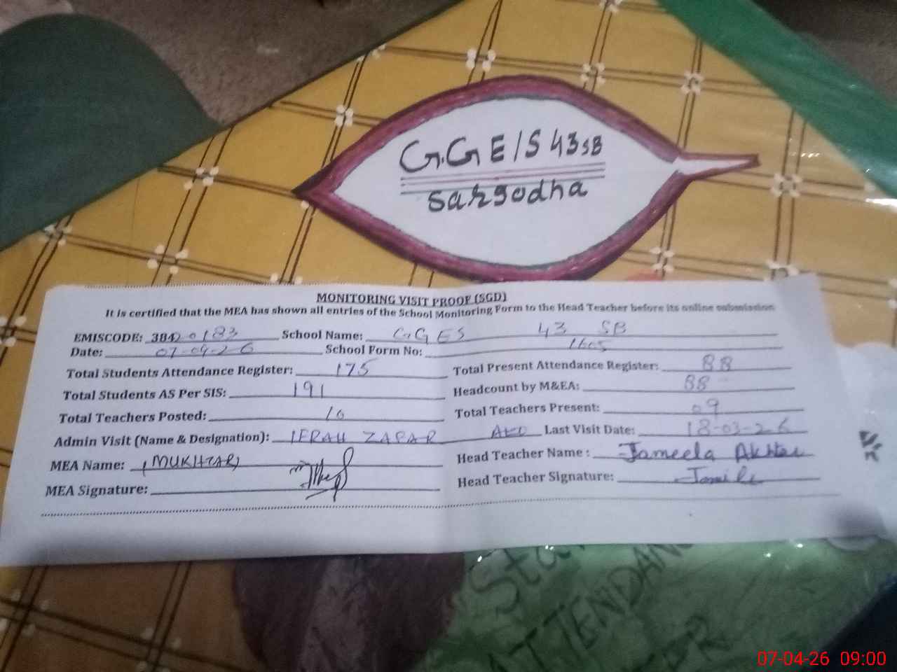 | EMIS Code: 38420183 | Name of School: GGES CHAK NO.43 SB | |||