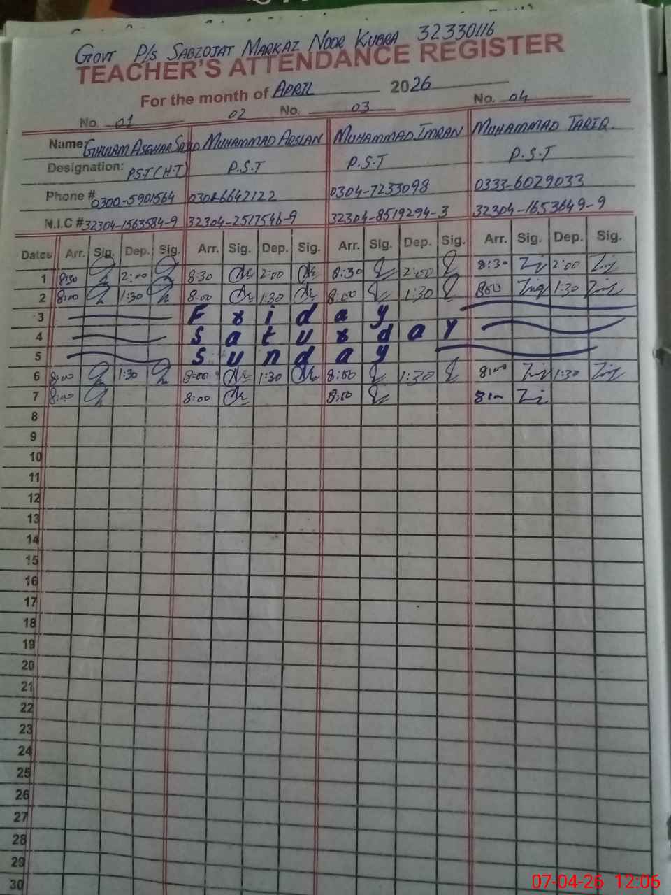 | CNIC | Full Name | Designation | R/C | Absence During Last Calender Month |