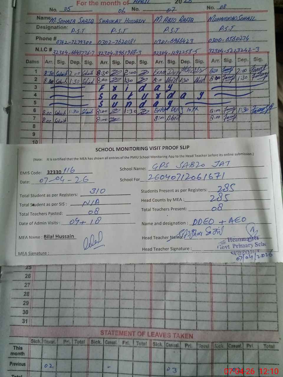 | Attendance Register | Head Teacher | MEA with School | Visit Proof |