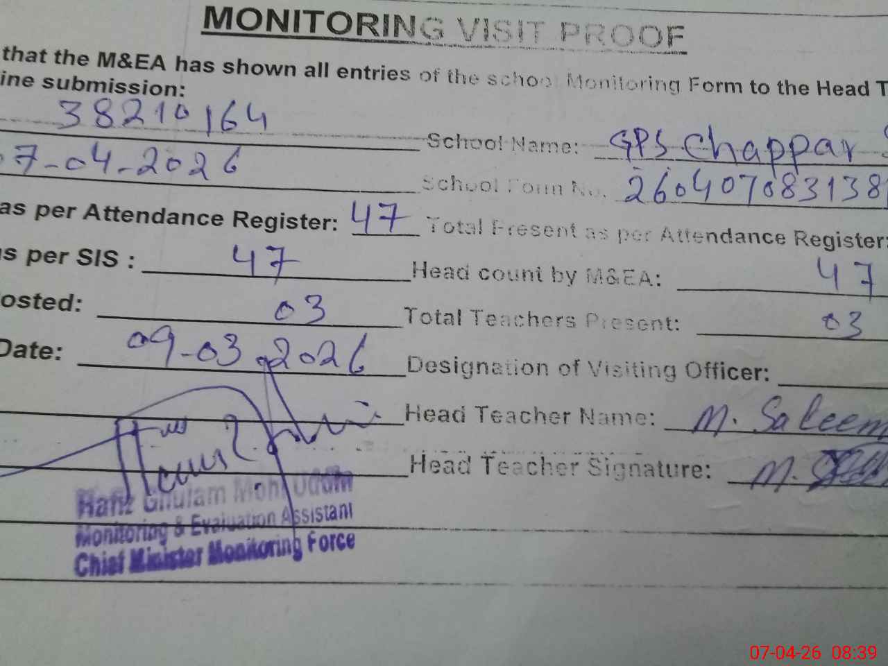 | EMIS Code: 38210164 | Name of School: GPS CHAPPAR SHARIF | |||