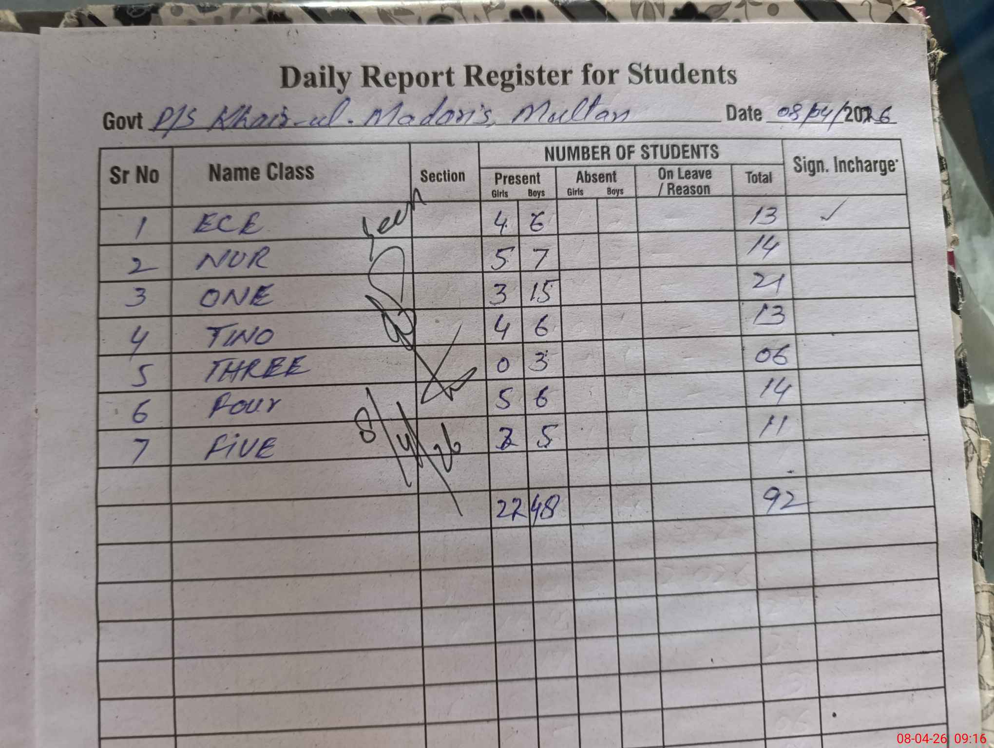 | No. of Students Present - Female | 0 | 5 | 3 | 4 | 0 | 6 | 4 | 26 | ||||||||