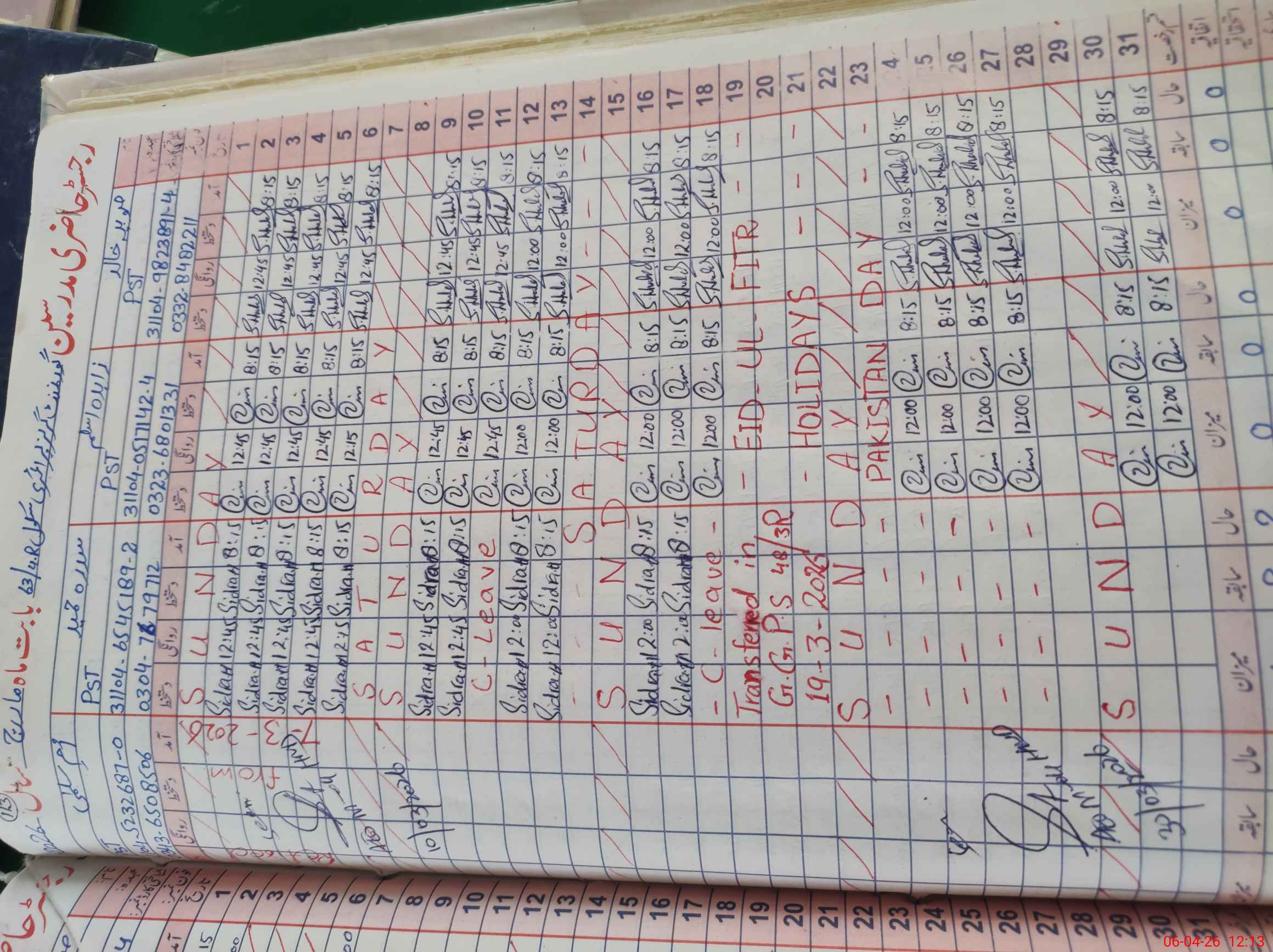 | CNIC | Full Name | Designation | R/C | Absence During Last Calender Month |