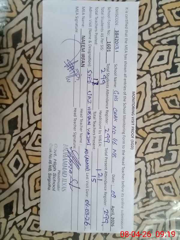 | EMIS Code: 38420131 | Name of School: GHS CHAK NO.46 NB | |||