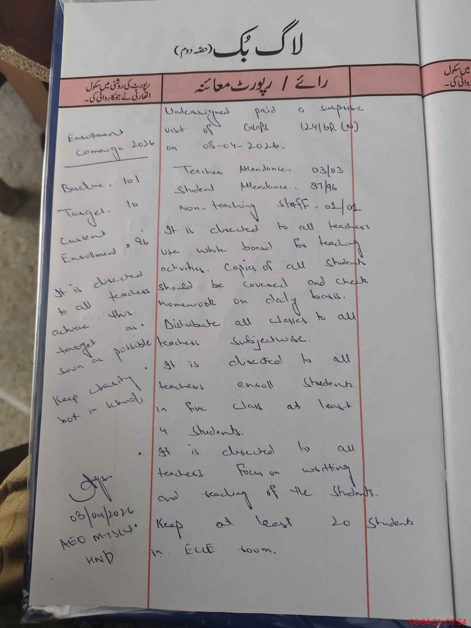 | Attendance Register | Head Teacher | MEA with School | Visit Proof |