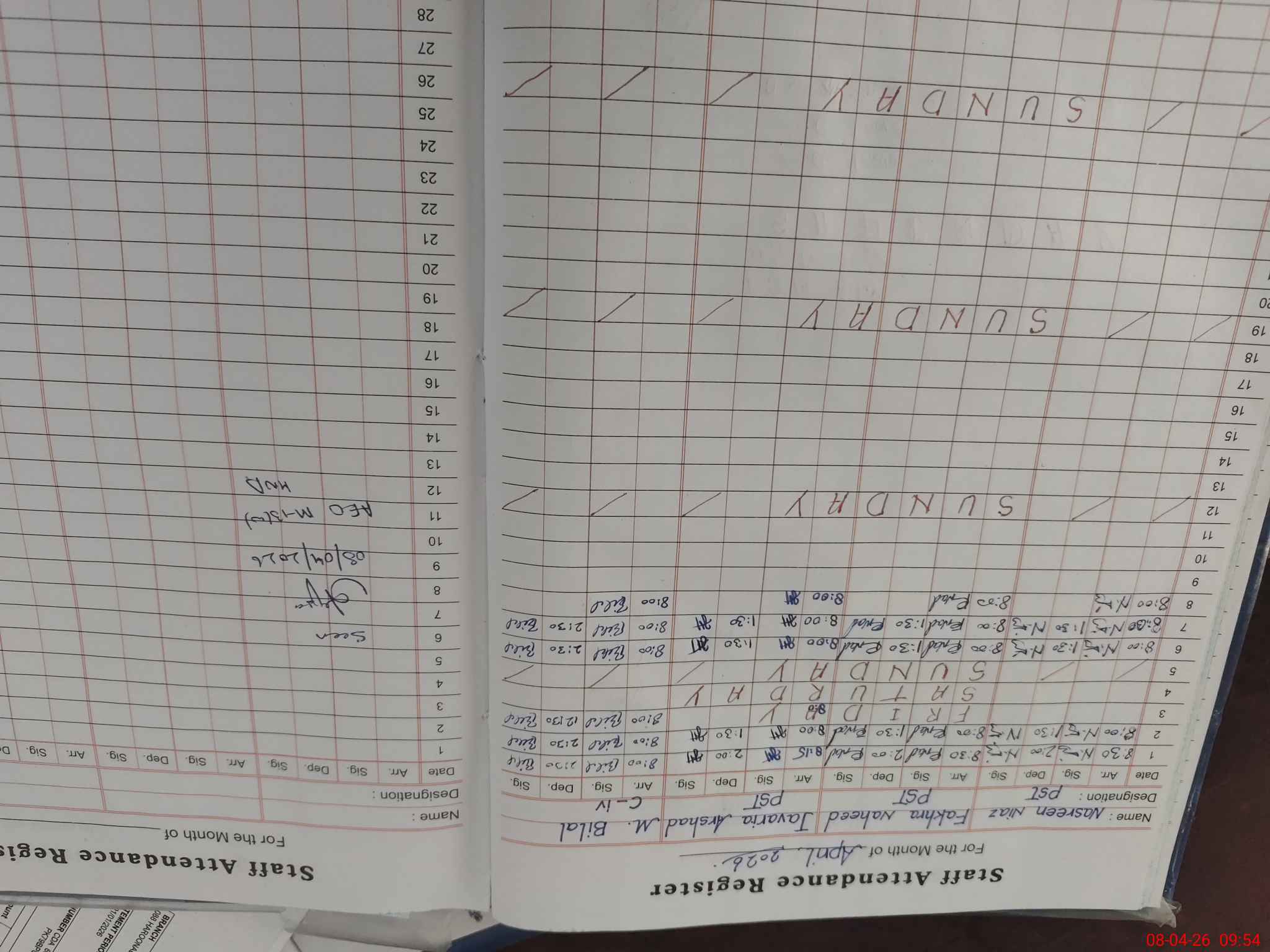 | CNIC | Full Name | Designation | R/C | Absence During Last Calender Month |