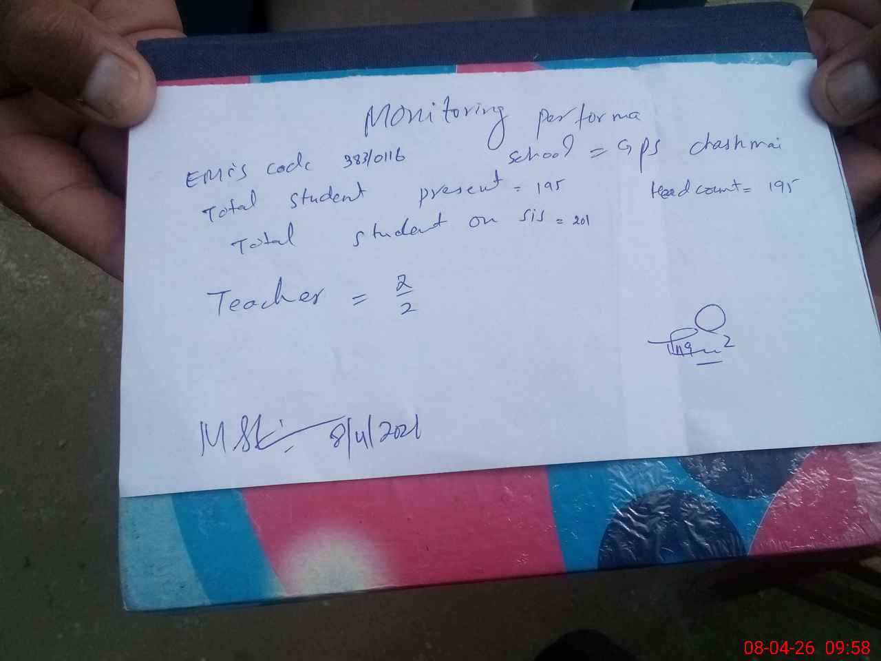 | Attendance Register | Head Teacher | MEA with School | Visit Proof |