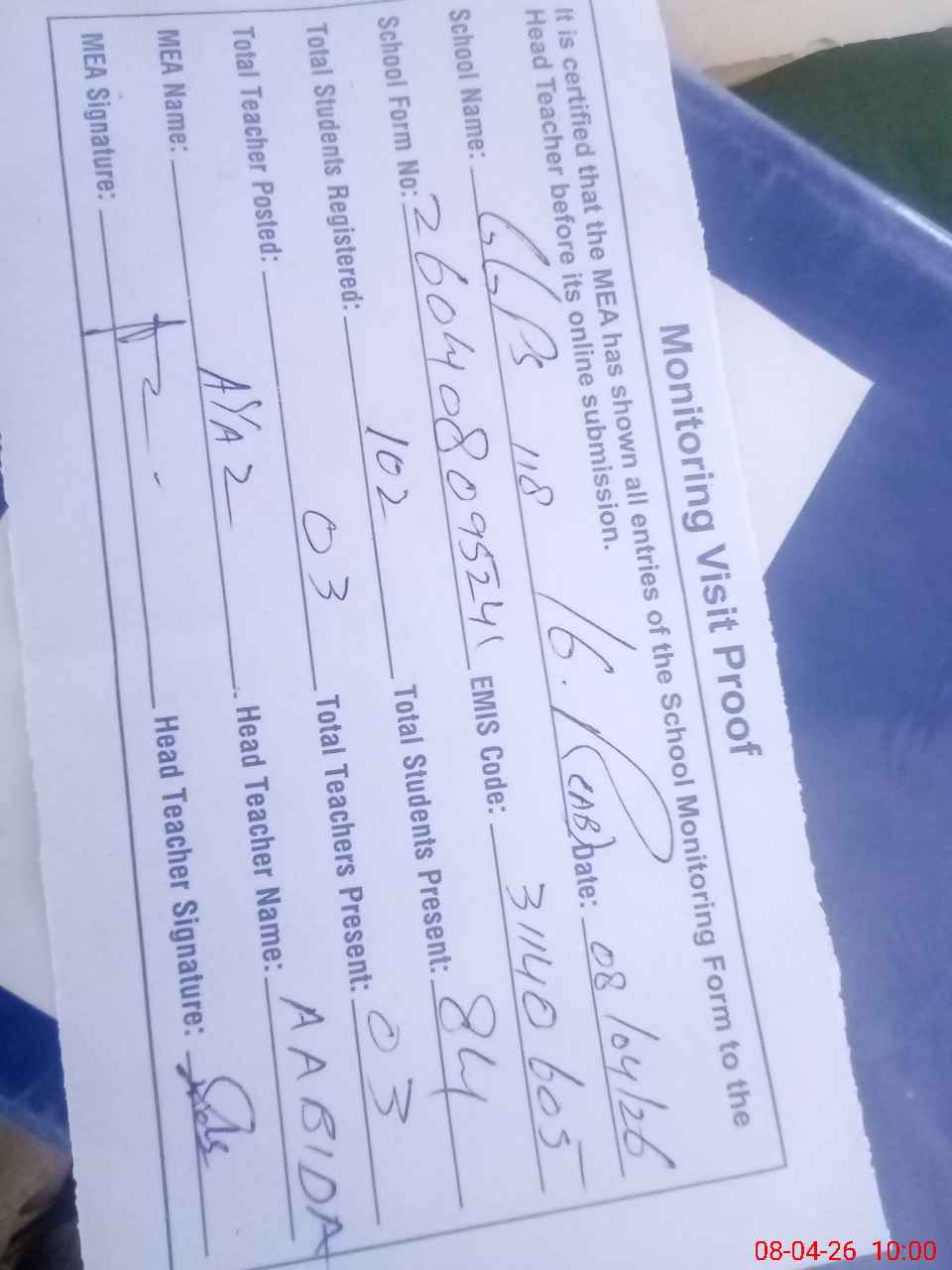 | Attendance Register | Head Teacher | MEA with School | Visit Proof |