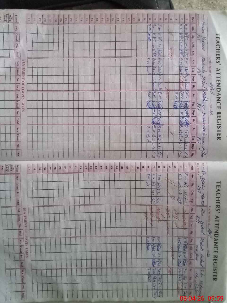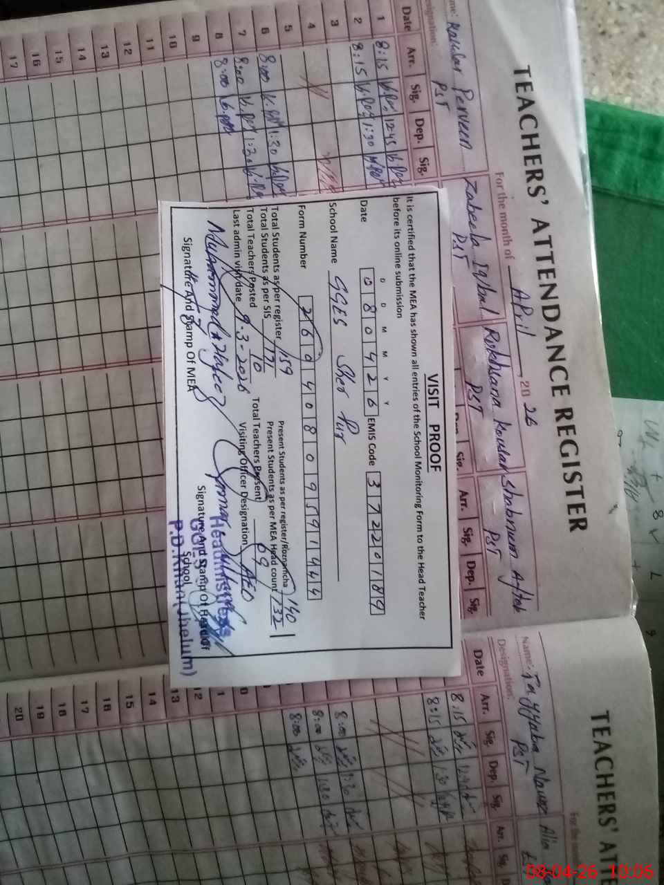 | Remarks (Use Separate Page if Required): Sir. *1* One student of 7th class is not coming from 1 April 2026 till to date 8-4-2026 but on register not action taken during visit after seen mark absent on register. *2* It Girls Elementary school but Boundary wall of this school is not complete picture are available. *3* School ground level is down from road and surrounding residential. School ground is full of water after rain and during rain picture available. *4* Students attendance on roznamacha not according the headcount picture of roznamacha available * Sir* Please check and take action. | |||||