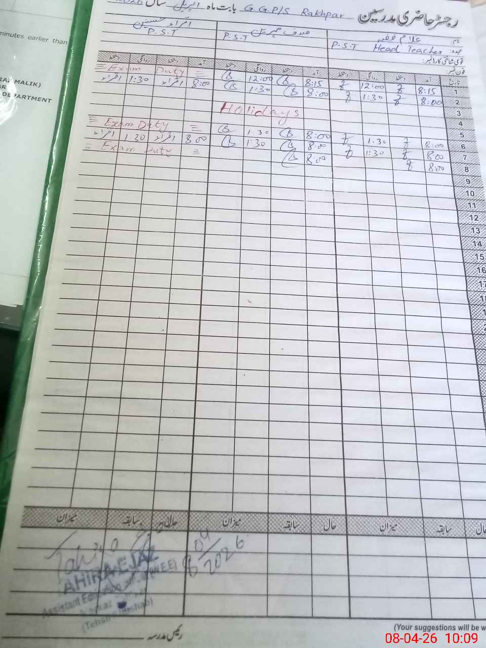 | 38**** | Iq**** Ha**** | PST Arts | Regular | 0 | 0 | 0 | 0 | 0 | 0 | 0 | 0 | 0 | Exam Duty |