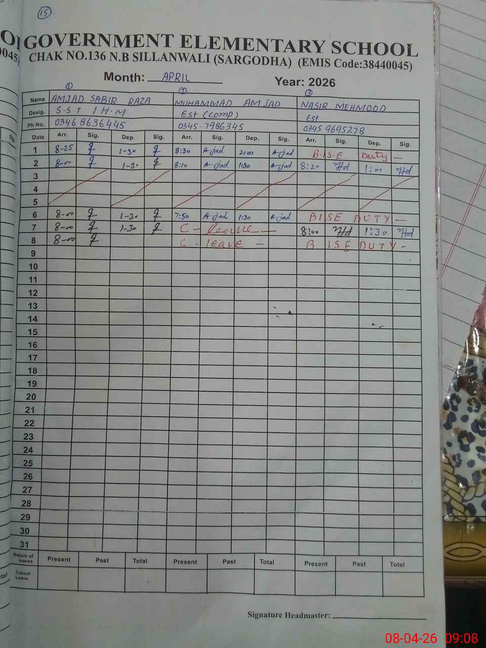 | Name: AM**** SA**** RA**** Designation: (School Headmaster's/Headmistress's) E.S.T.(Arts) Phone/Cell Number: 03**** |