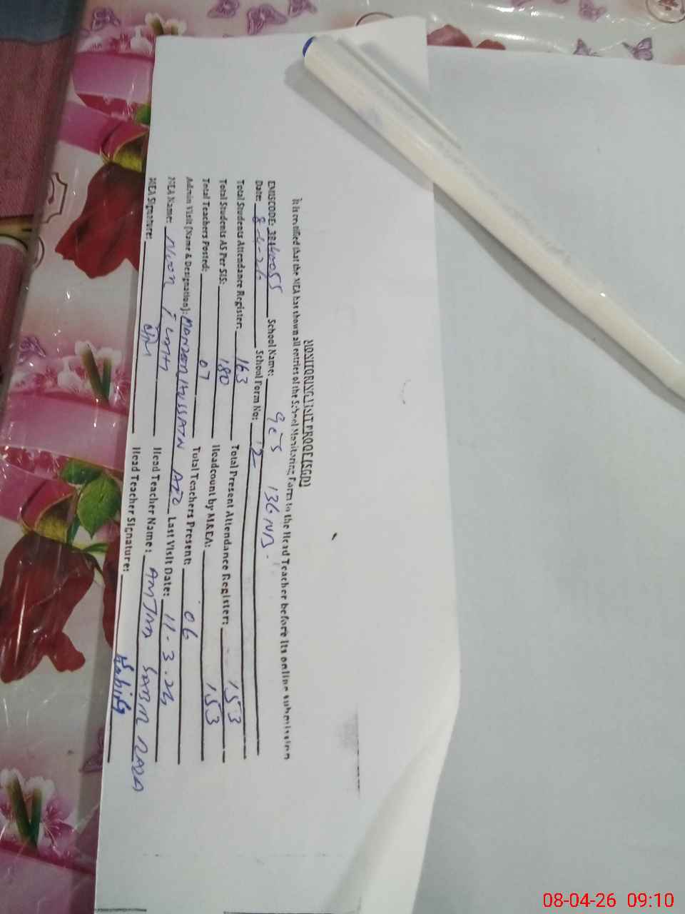 | Attendance Register | Head Teacher | MEA with School | Visit Proof |