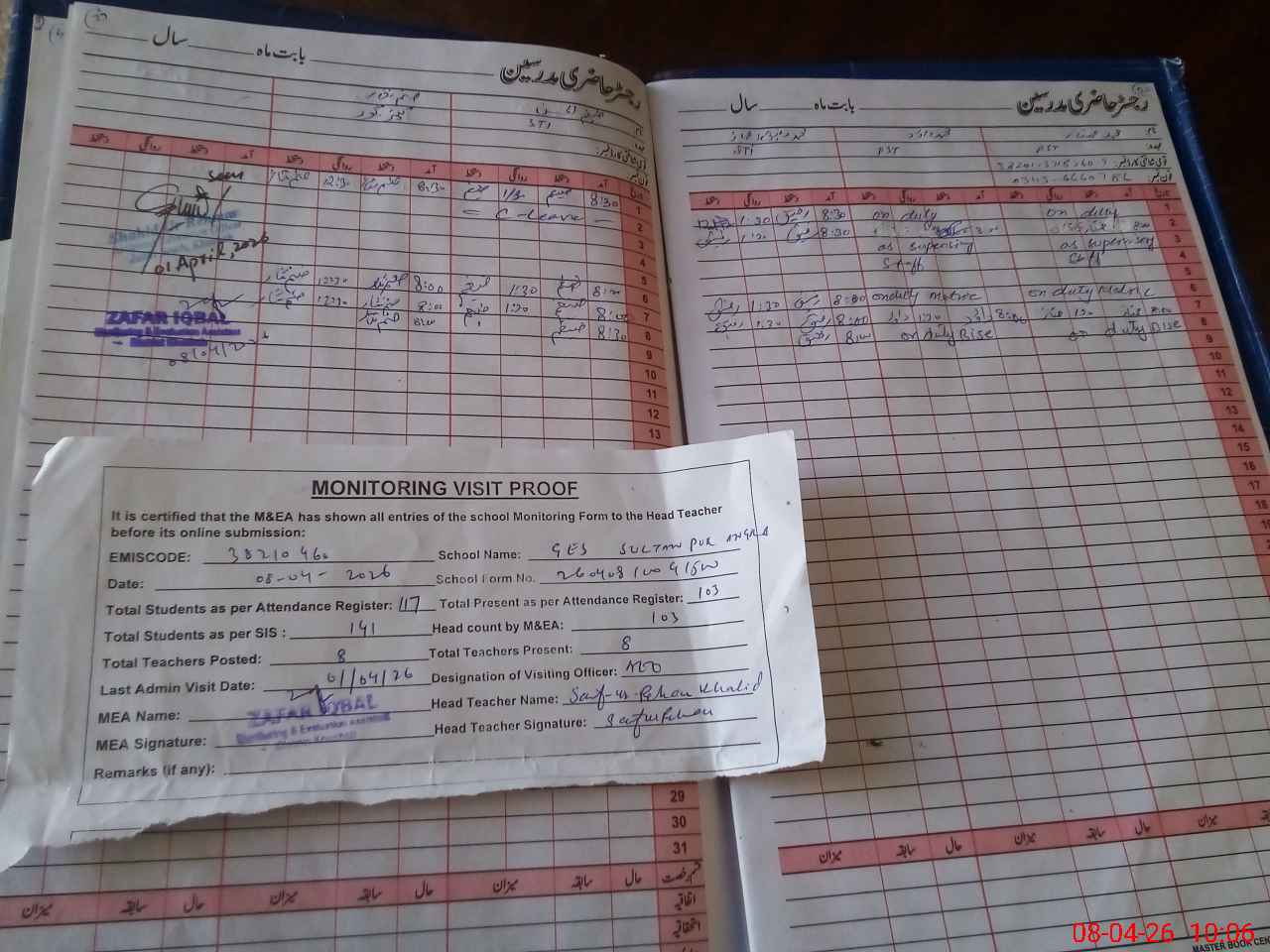 | Monitoring Date: 08-04-2026 | Start Time: 08-04-2026 09:39 AM | End Time: 08-04-2026 10:17 AM | Name of MEA: ZA**** IQ**** | |