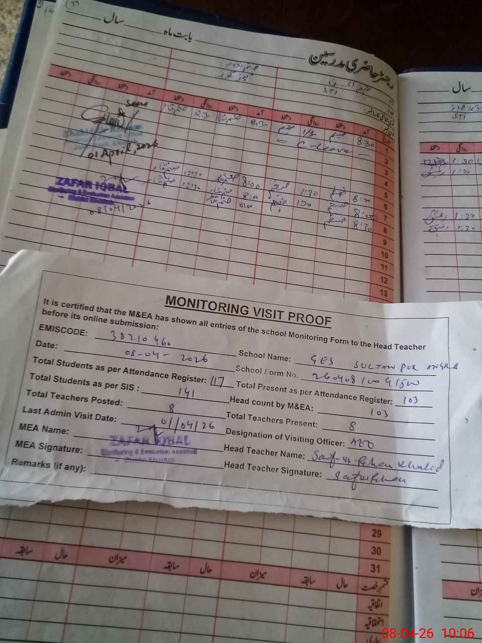 | Attendance Register | Head Teacher | MEA with School | Visit Proof |