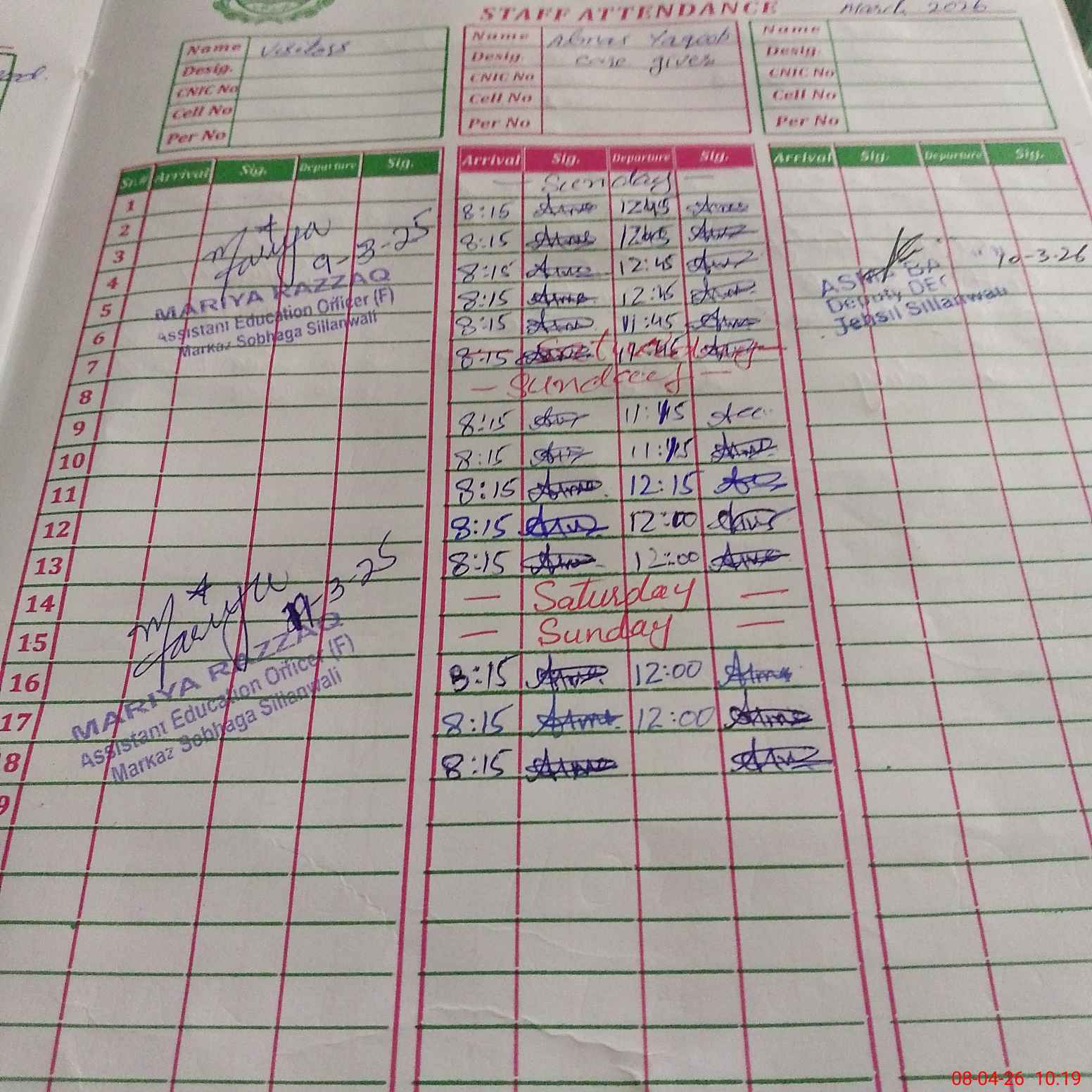 | CNIC | Full Name | Designation | R/C | Absence During Last Calender Month |
