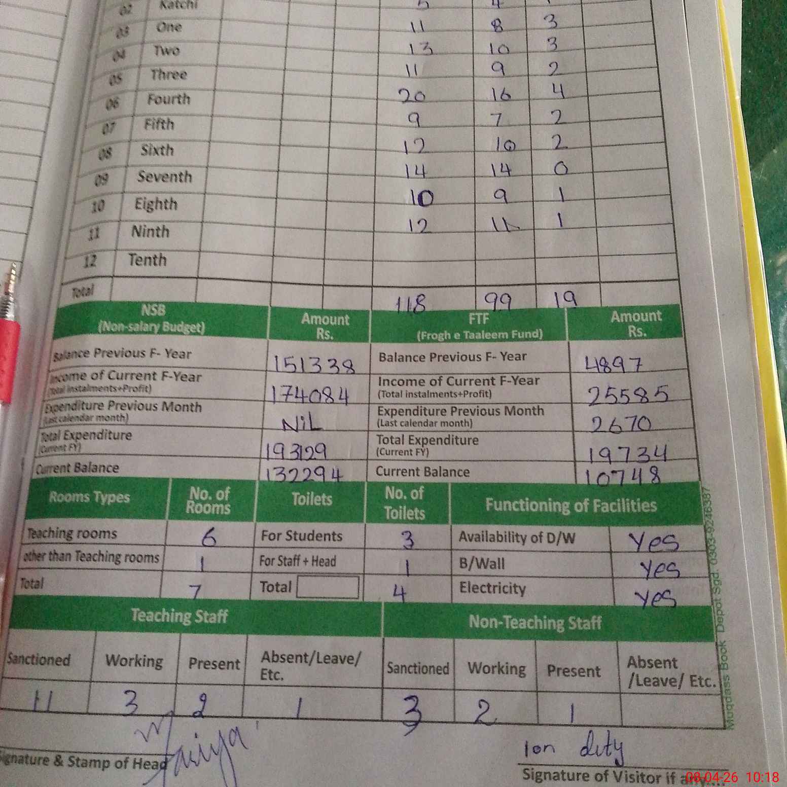 | Total no. of Classrooms: 7 No. of Classrooms Used for Teaching: 6 No. of Classrooms Storing Old Furniture, FTBs, etc: 0Comments if Any: 0 |