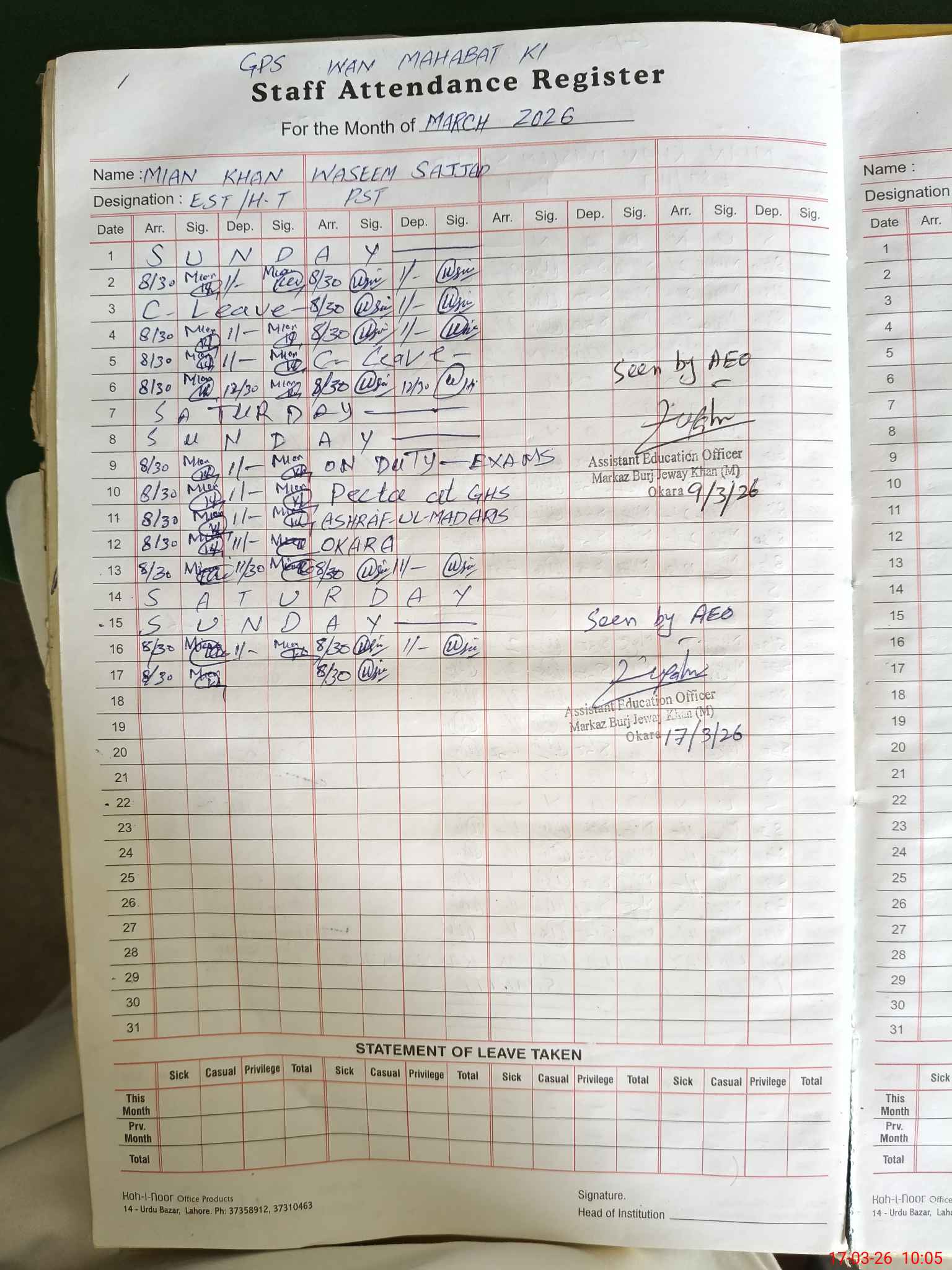 | Leave | Duty | Absent | Maternity | Medical | Ex- Pak |