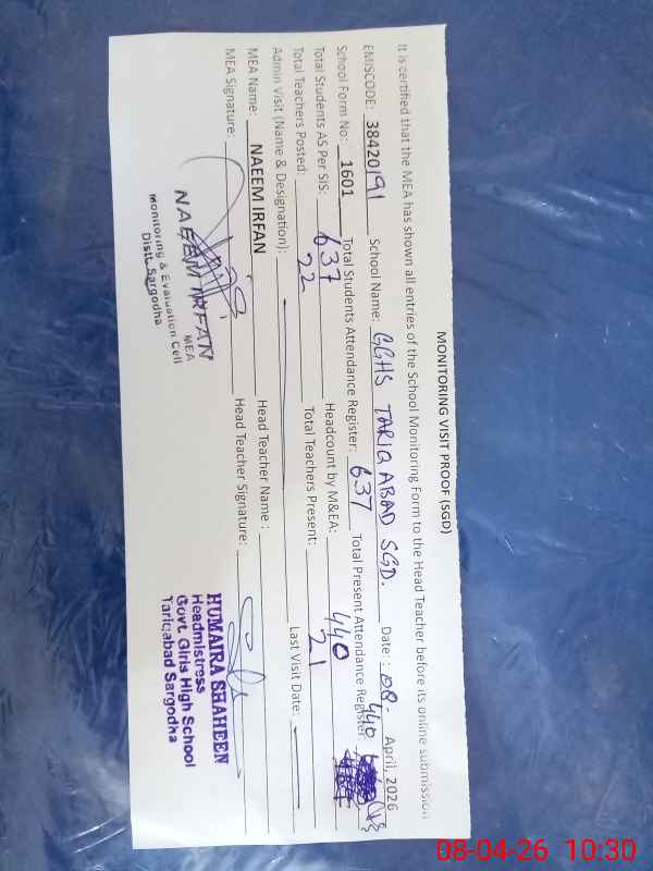 | EMIS Code: 38420191 | Name of School: GGHS TARIQ ABAD SARGODHA | |||