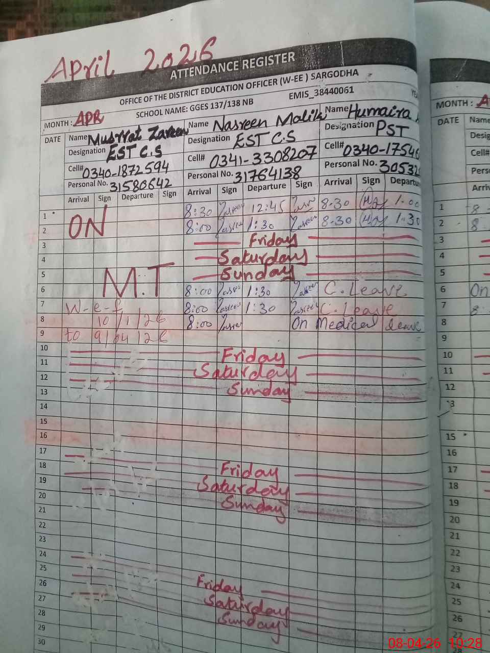 | 38**** | Zu**** Pa**** | PST Arts | Regular | 2 | 0 | 0 | 0 | 0 | 0 | 0 | 0 | 2 | Exam Duty |