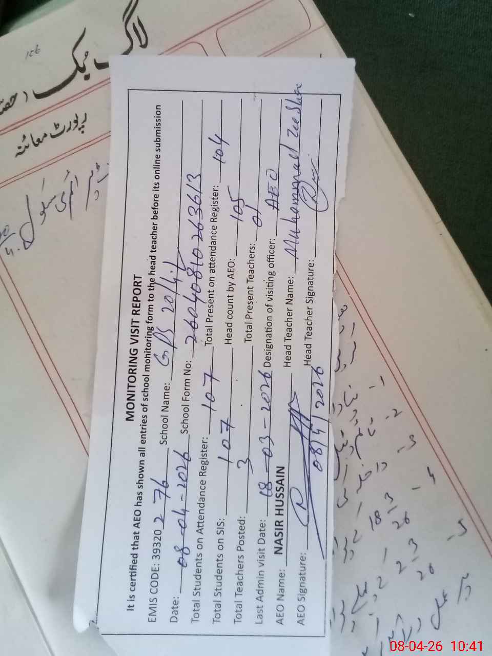 | Attendance Register | Head Teacher | MEA with School | Visit Proof |
