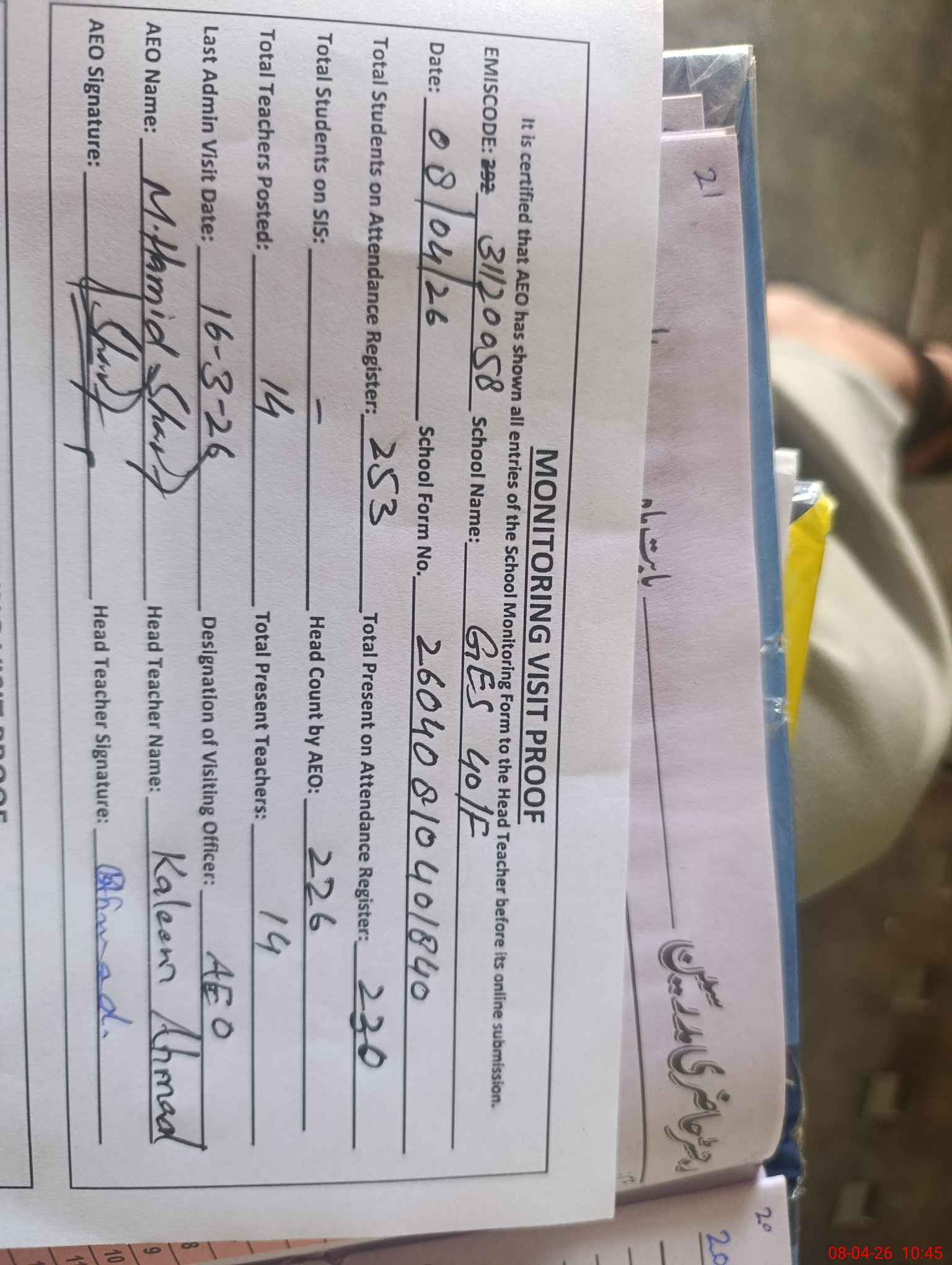 | Attendance Register | Head Teacher | MEA with School | Visit Proof |