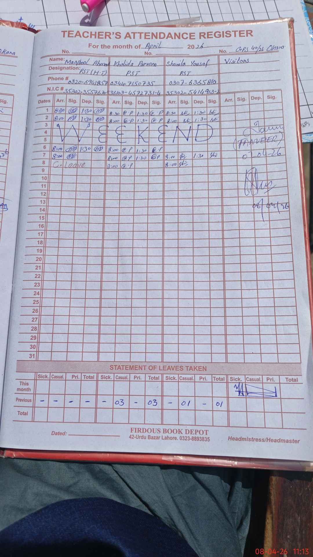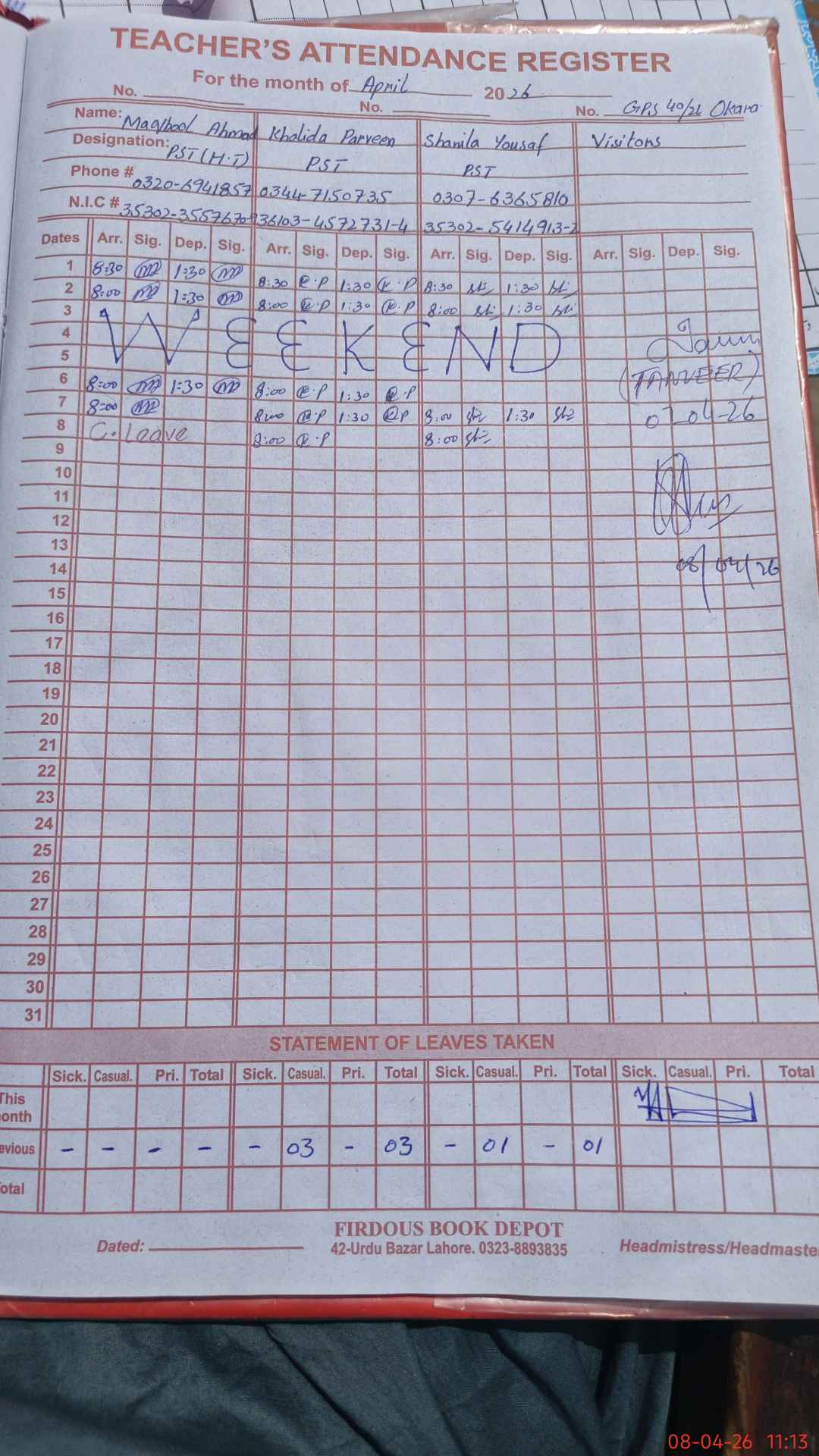 | CNIC | Full Name | Designation | R/C | Absence During Last Calender Month |