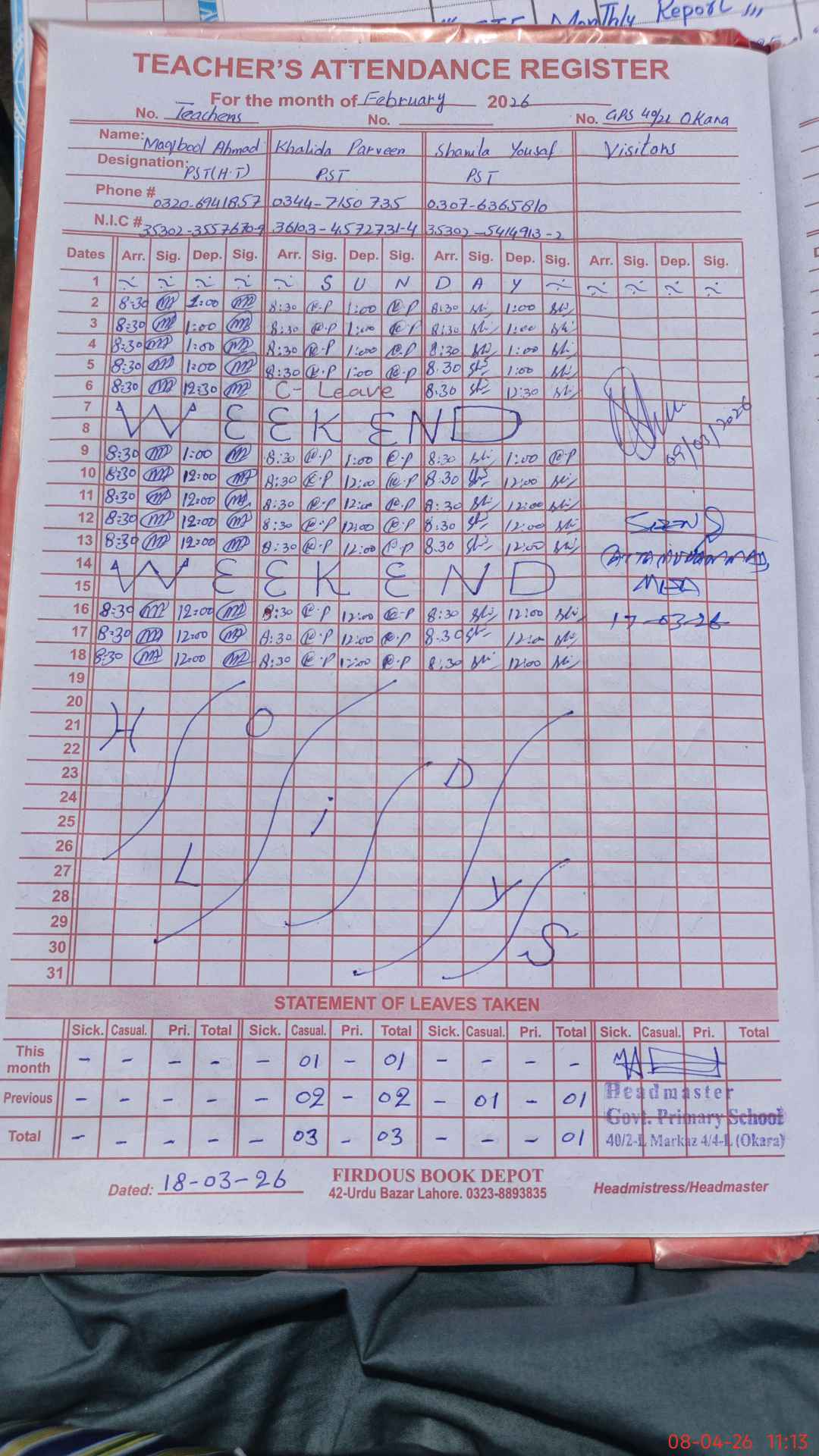 | Name: Ma**** Ah**** Designation: (School Headmaster's/Headmistress's) PST Phone/Cell Number: 03**** |