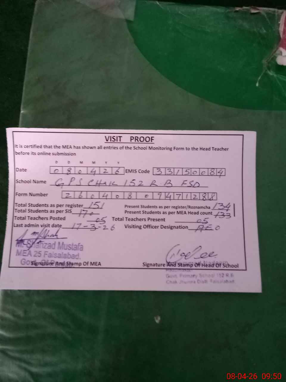 | Attendance Register | Head Teacher | MEA with School | Visit Proof |