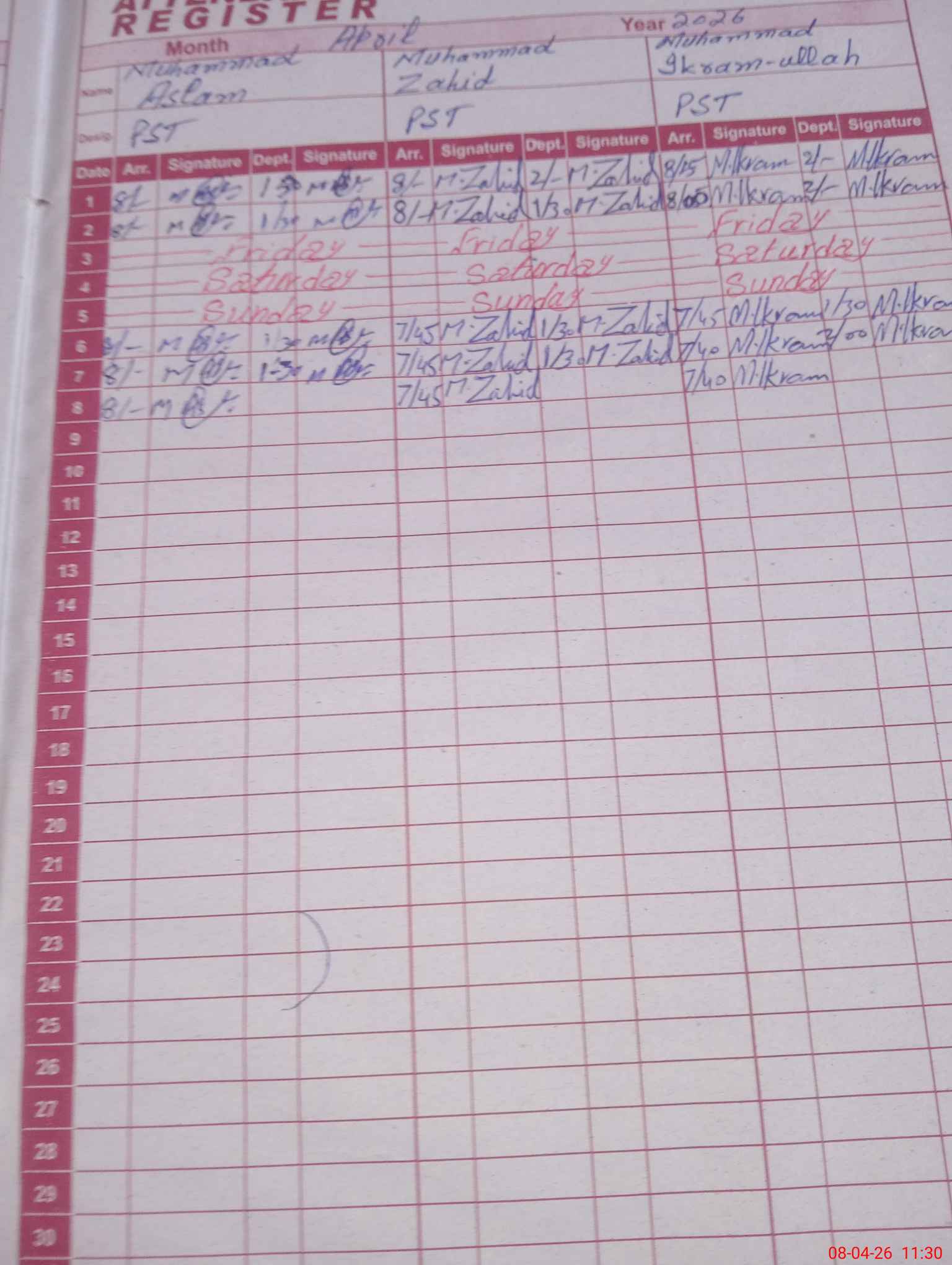 | CNIC | Full Name | Designation | R/C | Absence During Last Calender Month |