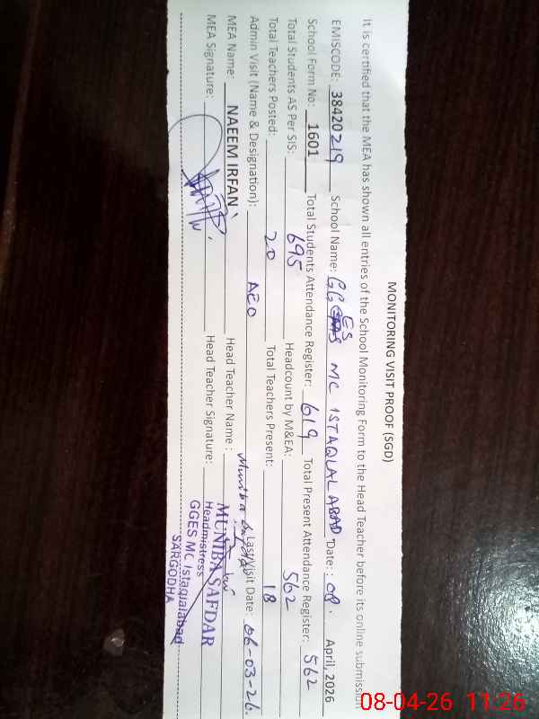 | EMIS Code: 38420219 | Name of School: GGES MC ISTAQLAL ABAD SARGODHA | |||