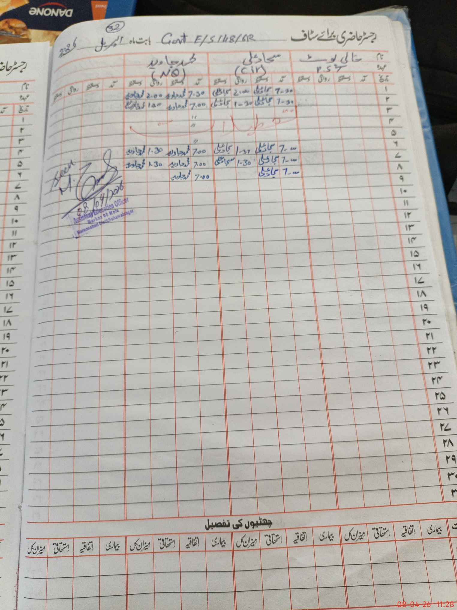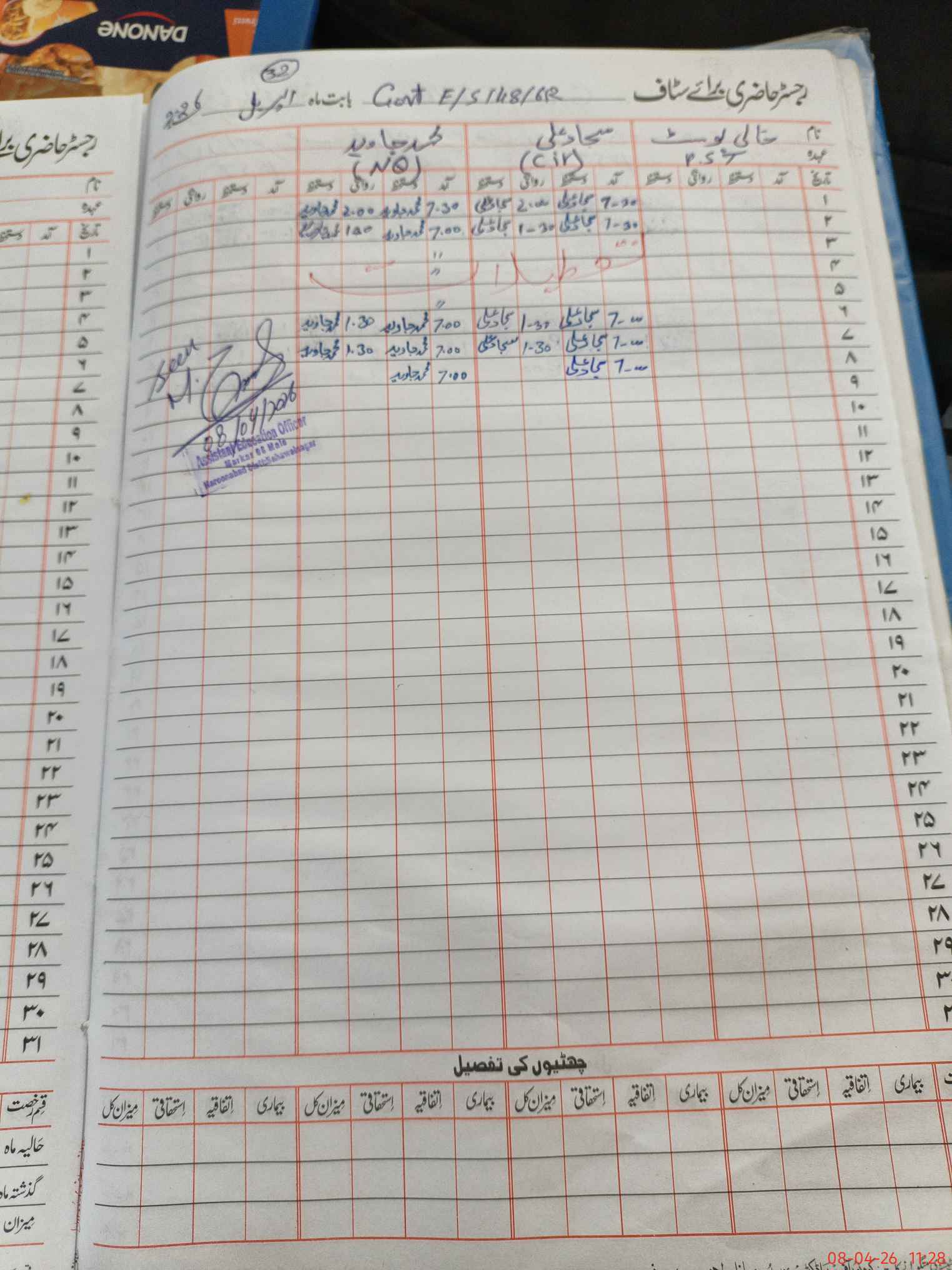 | CNIC | Full Name | Designation | R/C | Absence During Last Calender Month |