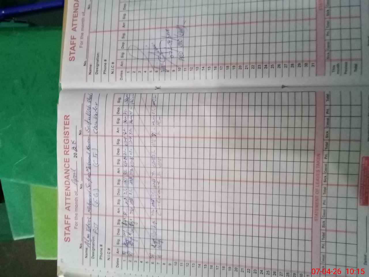 | CNIC | Full Name | Designation | R/C | Absence During Last Calender Month |