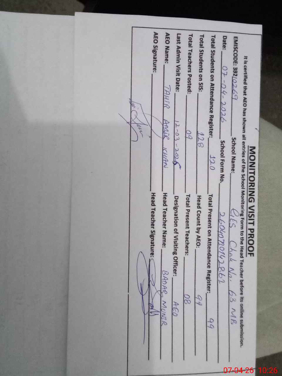 | Certified that this School was Inspected by the Undersigned MEA/DMO Today and the Information Stated Above is as Per Record. | |||||