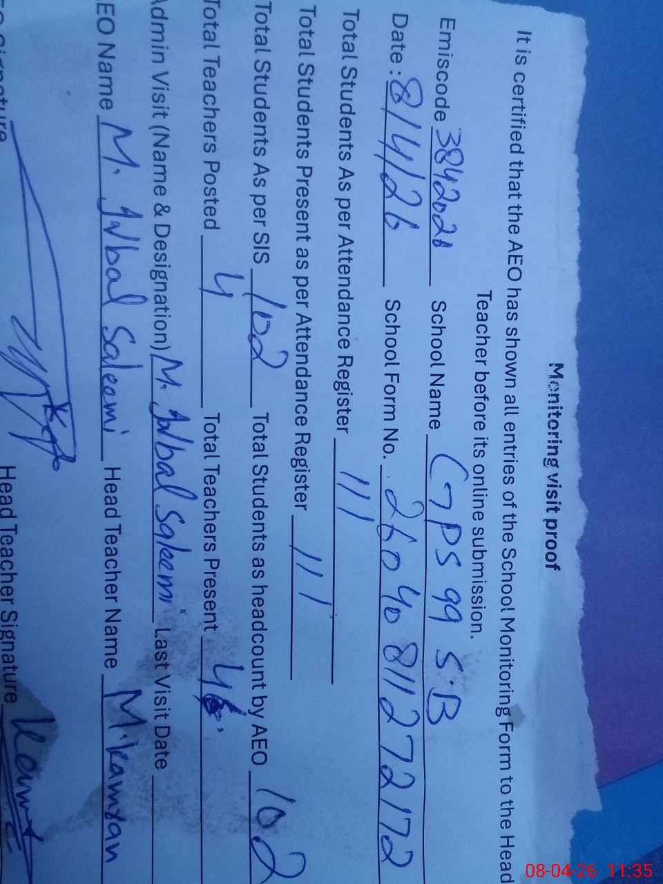 | EMIS Code: 38420261 | Name of School: GPS CHAK NO.99 SB | |||