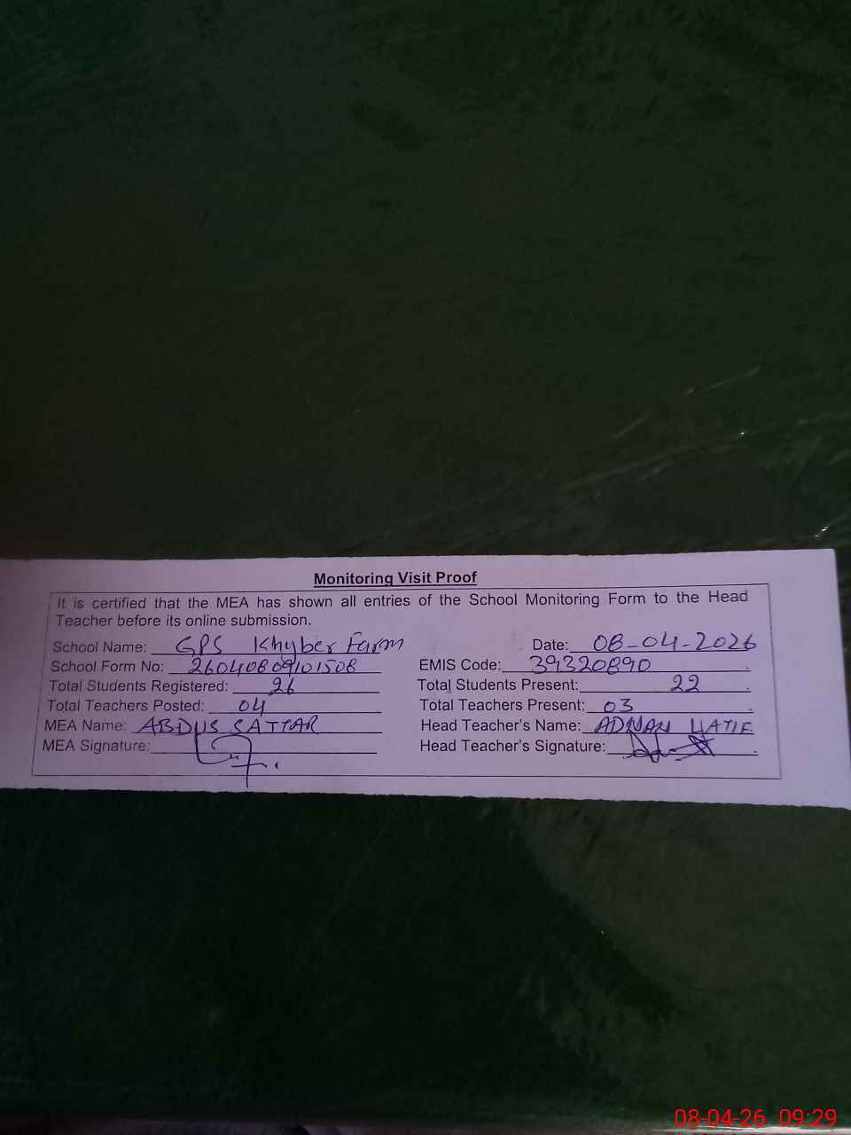 | EMIS Code: 39320890 | Name of School: GPS ADP KHYBER FARM | |||