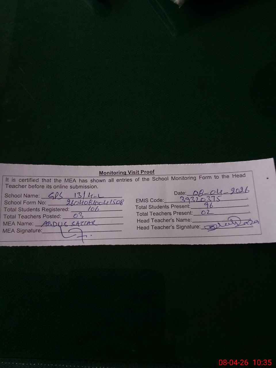 | Attendance Register | Head Teacher | MEA with School | Visit Proof |
