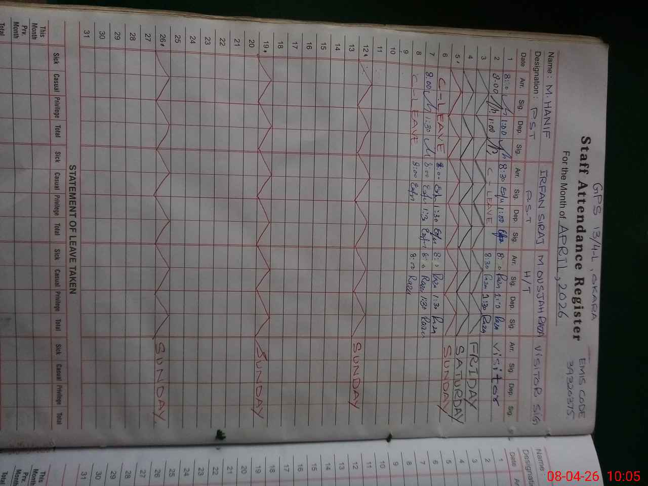 | CNIC | Full Name | Designation | R/C | Absence During Last Calender Month |