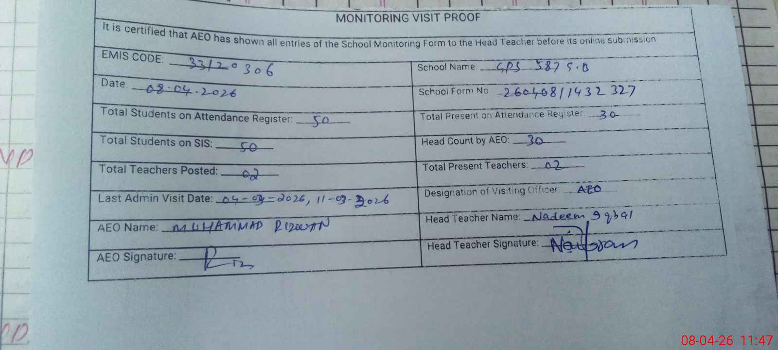 | EMIS Code: 33120306 | Name of School: GPS CHAK 587 GB JARANWALA FSD | |||