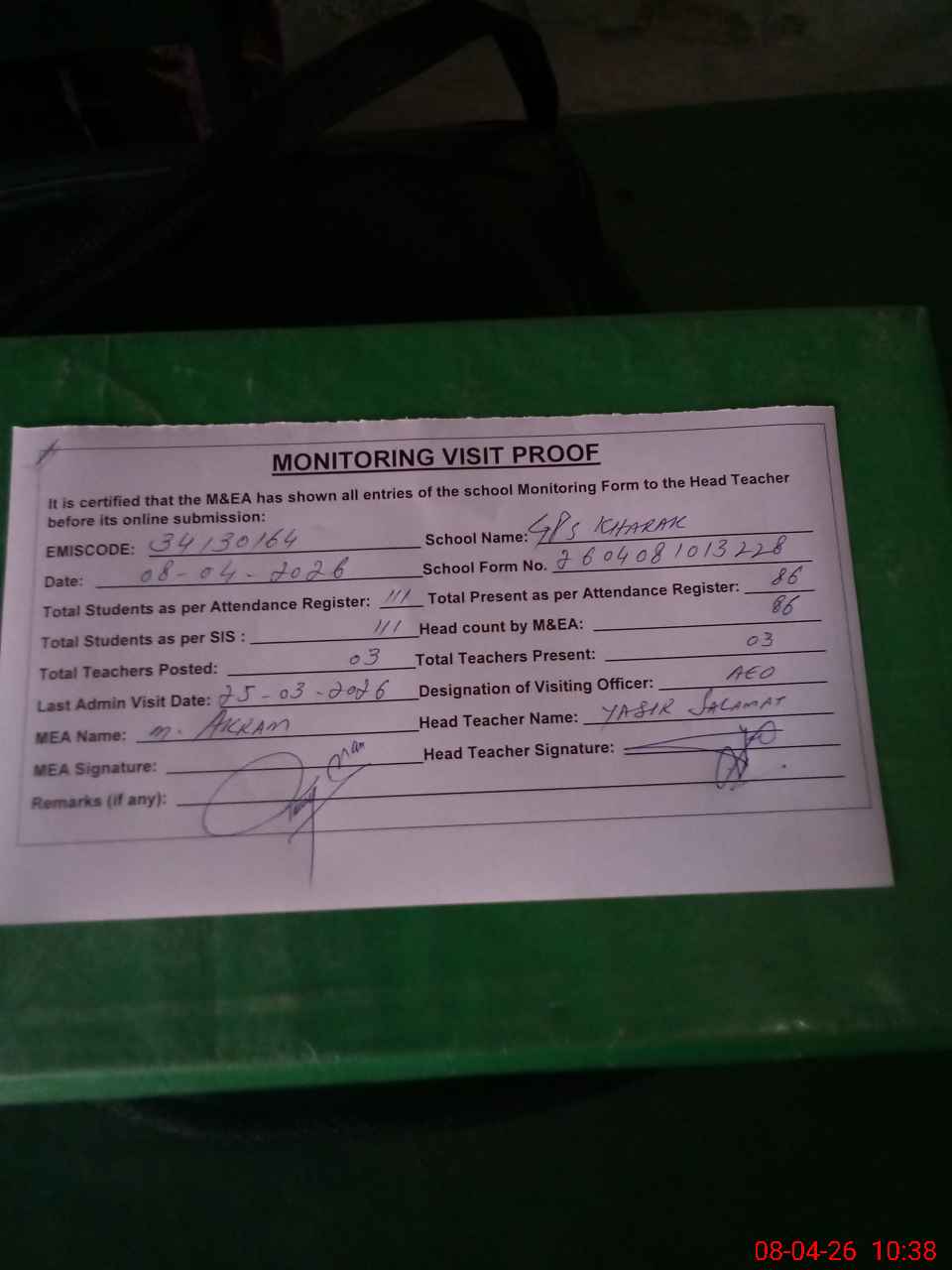 | Attendance Register | Head Teacher | MEA with School | Visit Proof |