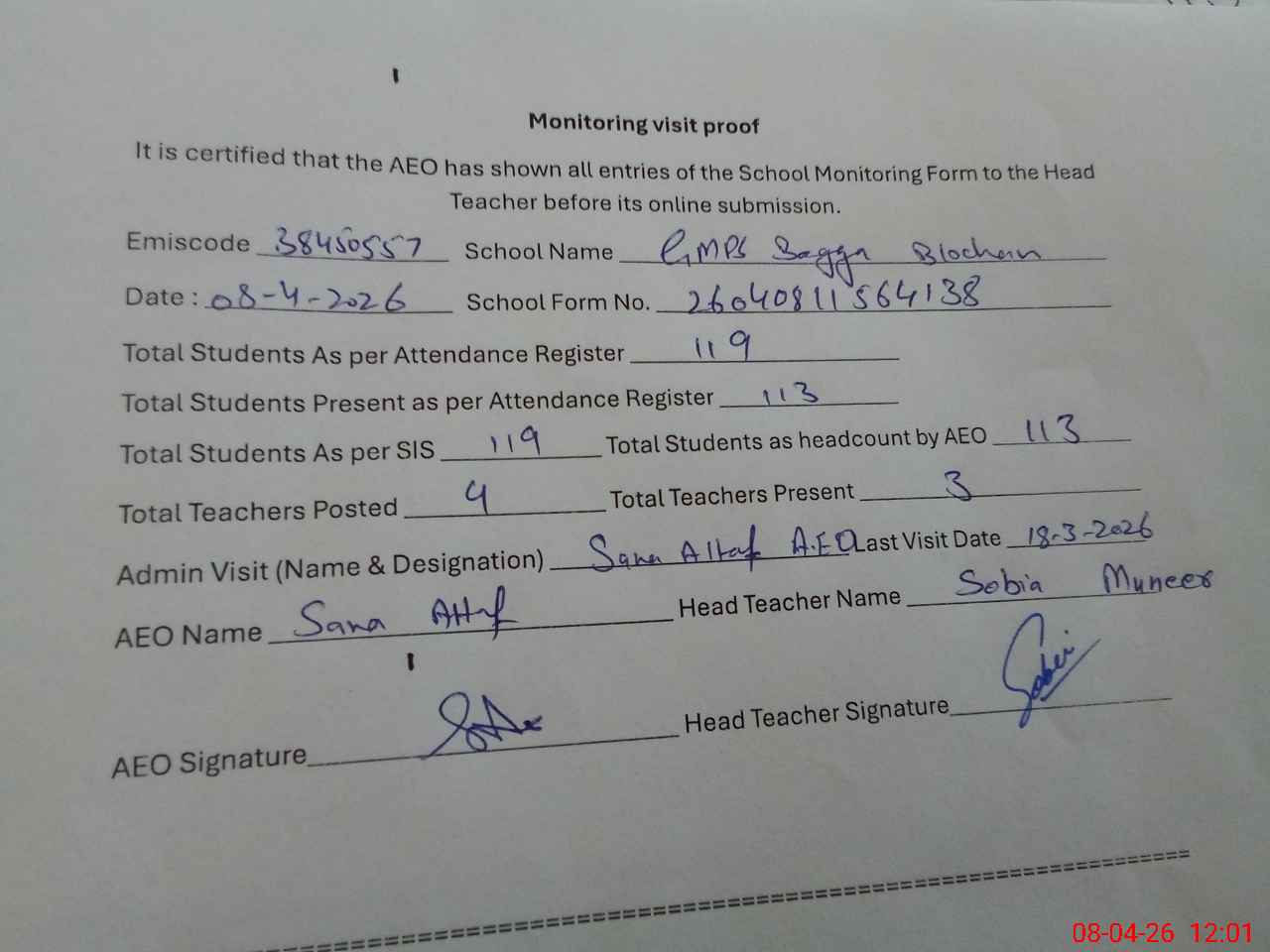 | Attendance Register | Head Teacher | MEA with School | Visit Proof |