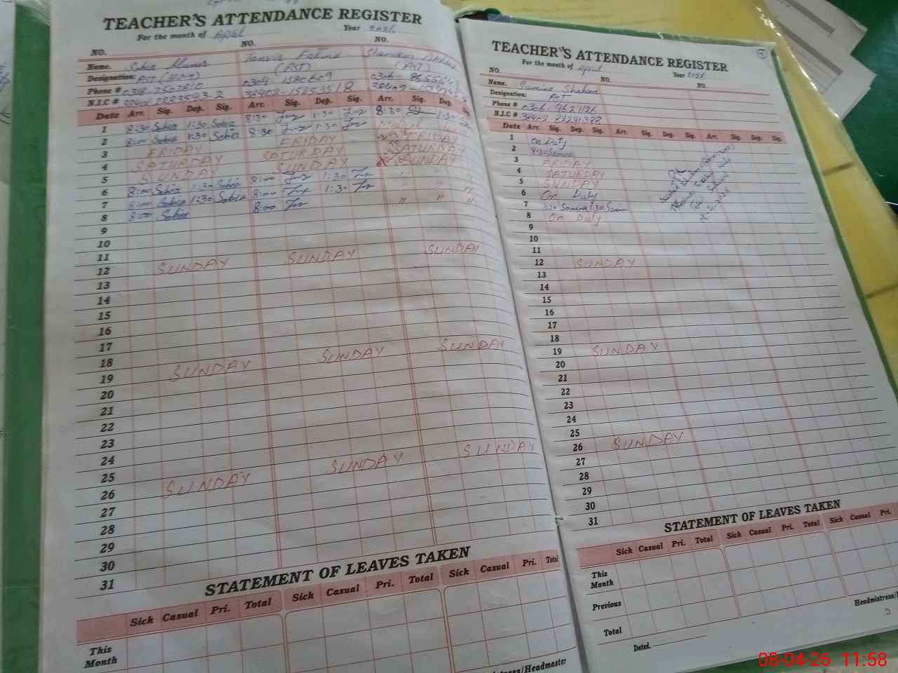 | CNIC | Full Name | Designation | R/C | Absence During Last Calender Month |