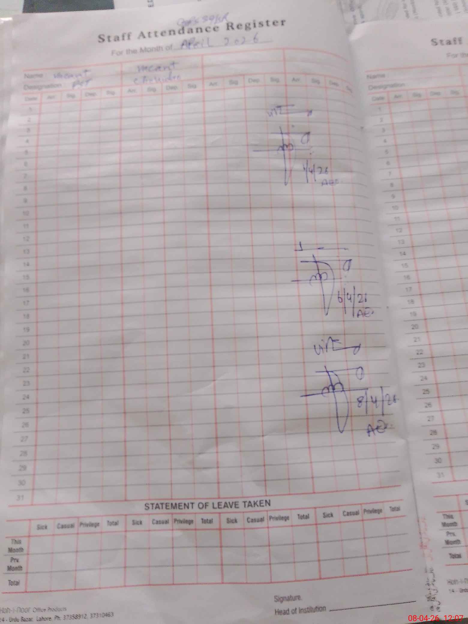 | Attendance Register | Head Teacher | MEA with School | Visit Proof |